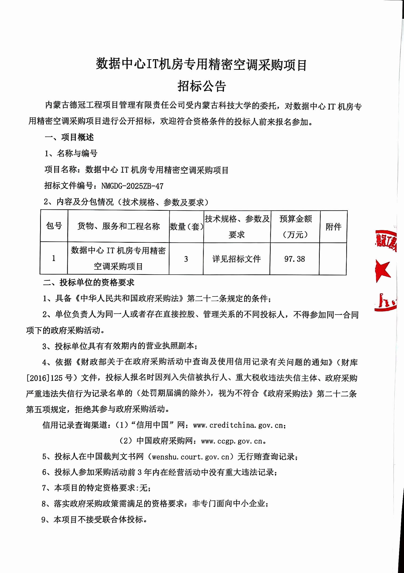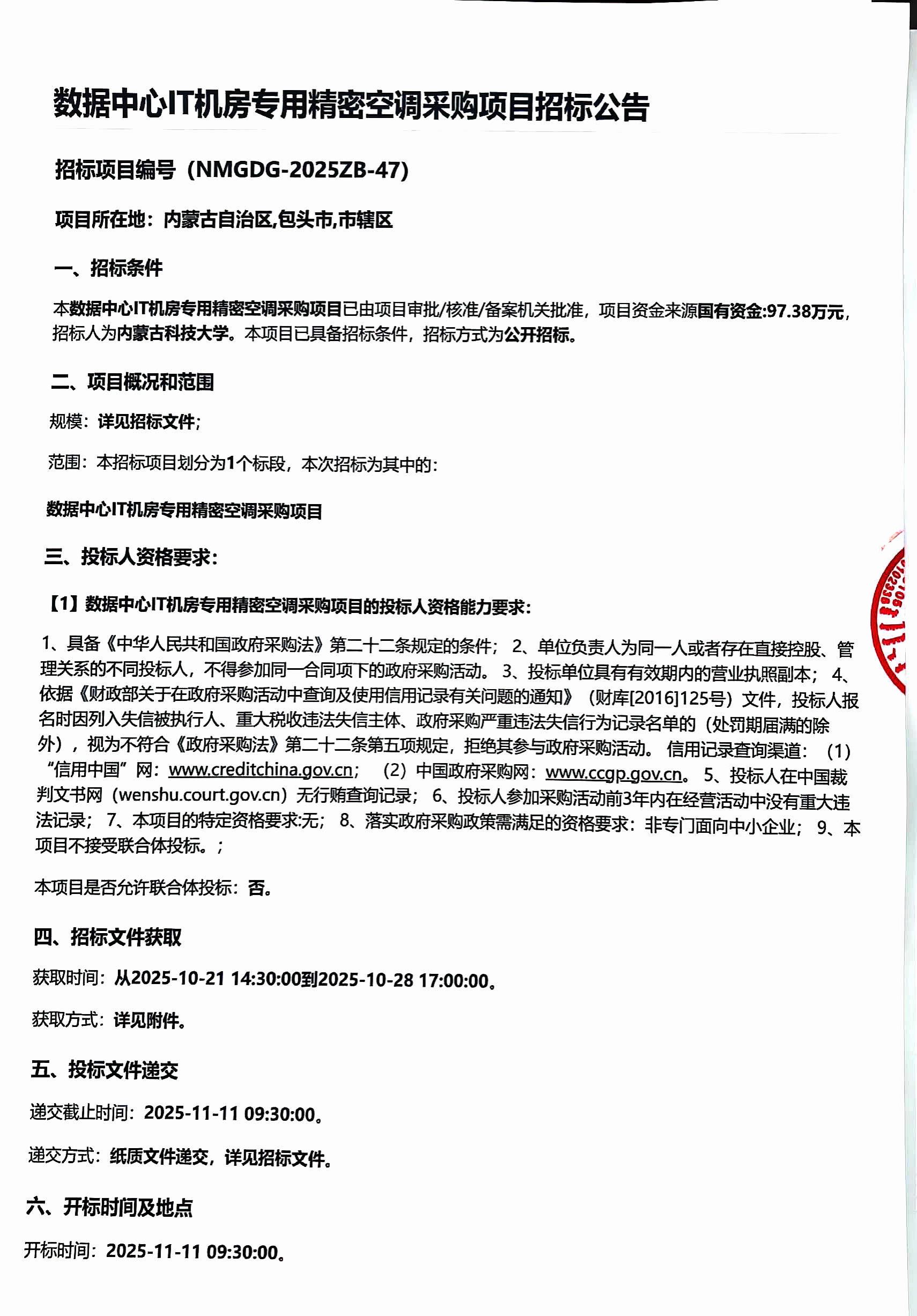 变更:项目名称变更为“内蒙古科技大学数据中心IT机房专用精密空调采购项目”,其他内容不变。变更网址:https://bulletin.nmgztb.com.cn/?bulletinId=ddc0b474a168af49153978d7b4e55d22