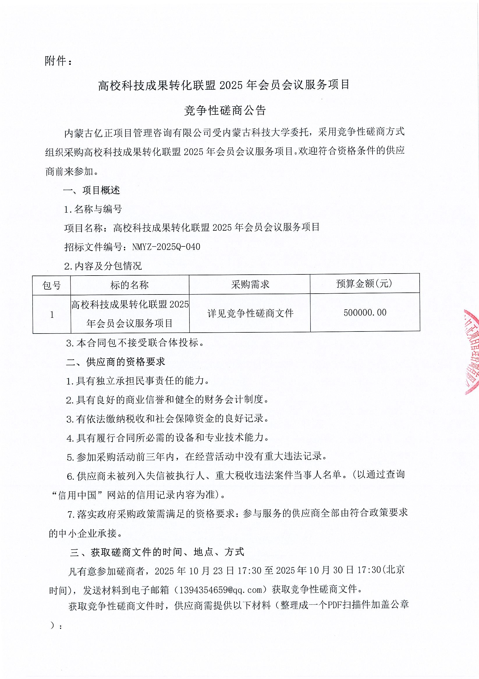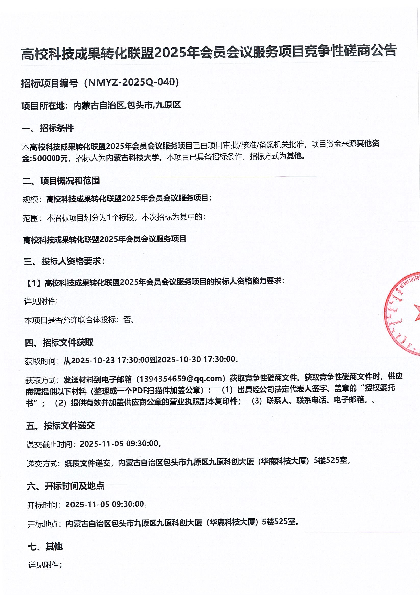变更:项目名称变更为:“内蒙古科技大学高校科技成果转化联盟2025年会员会议服务项目”,其他内容不变。变更网址:https://bulletin.nmgztb.com.cn/?bulletinId=1c75379b92d4154a4fc9274a85eb754c