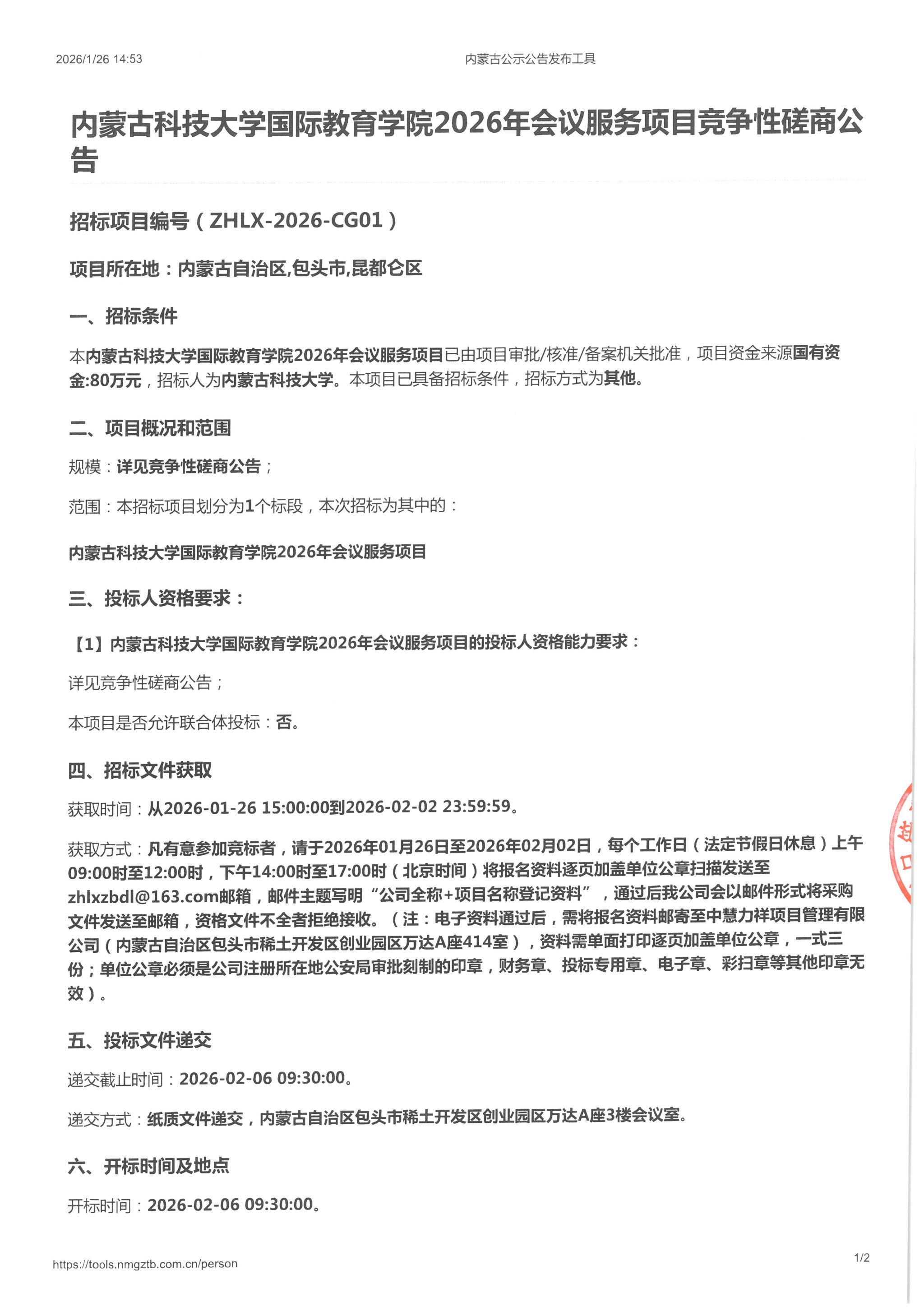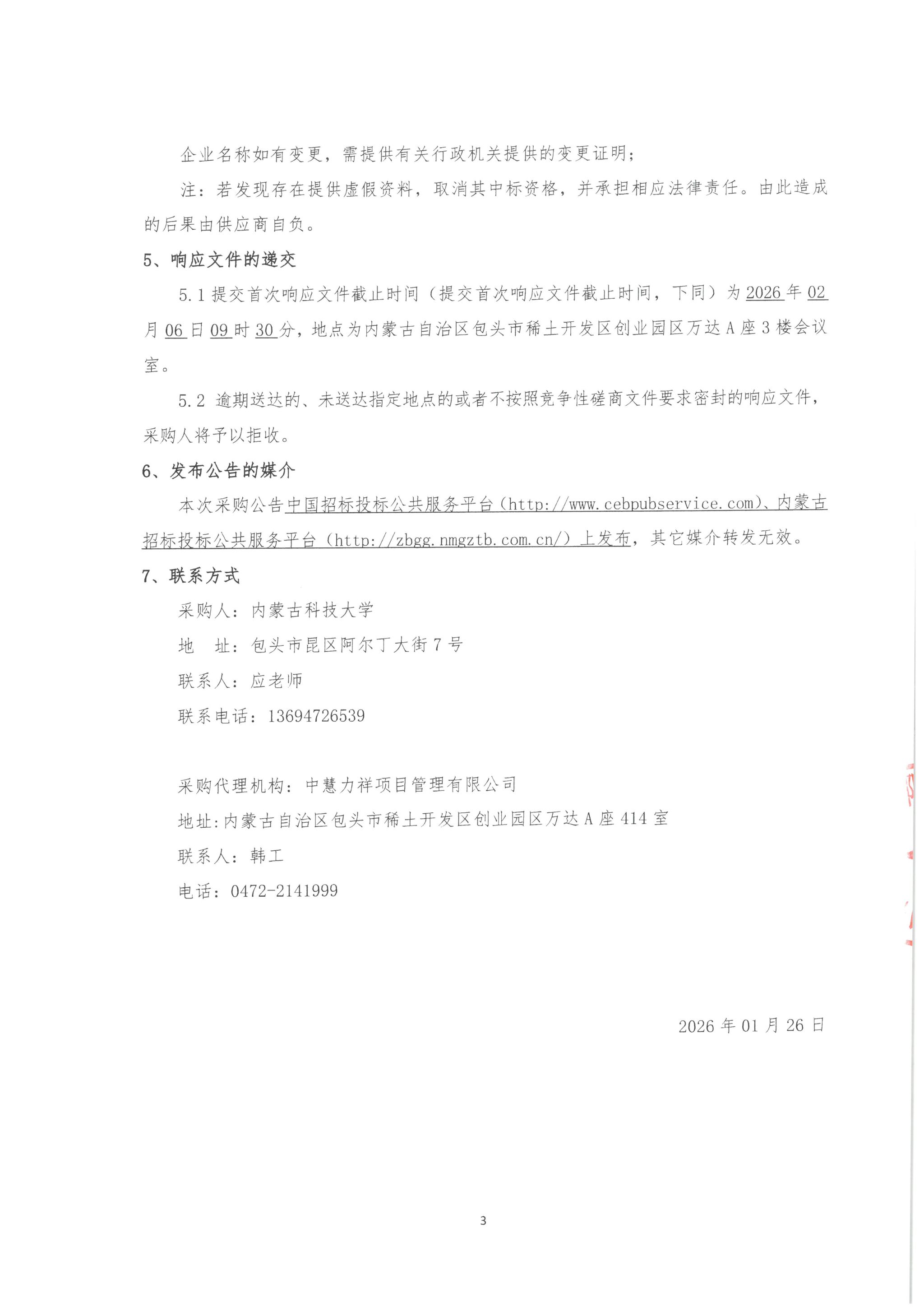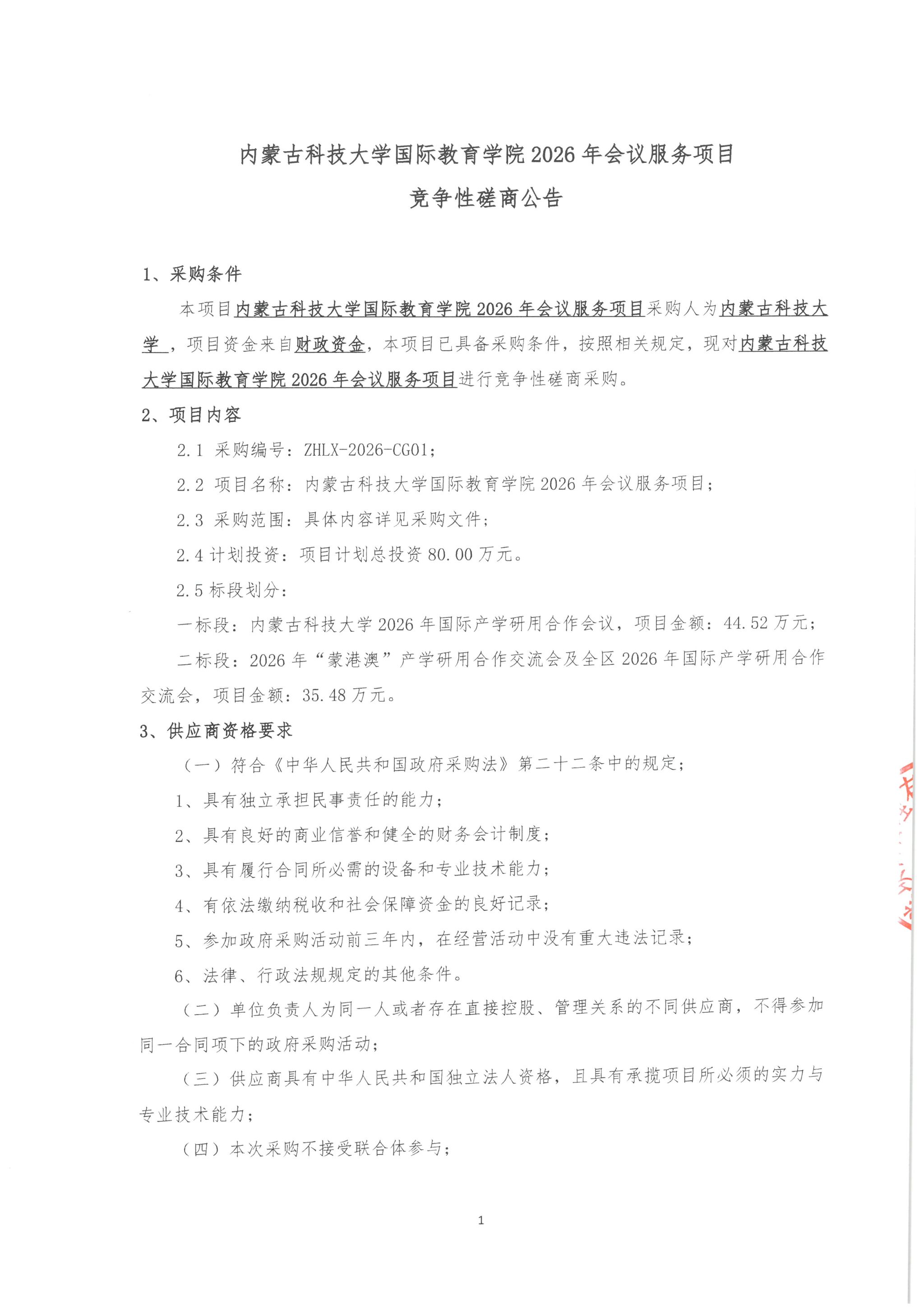 上一条:内蒙古科技大学中外青年文化交流及国际技能培训服务采购项目招标公告 下一条:内蒙古科技大学实习用车服务项目(二次)招标公告