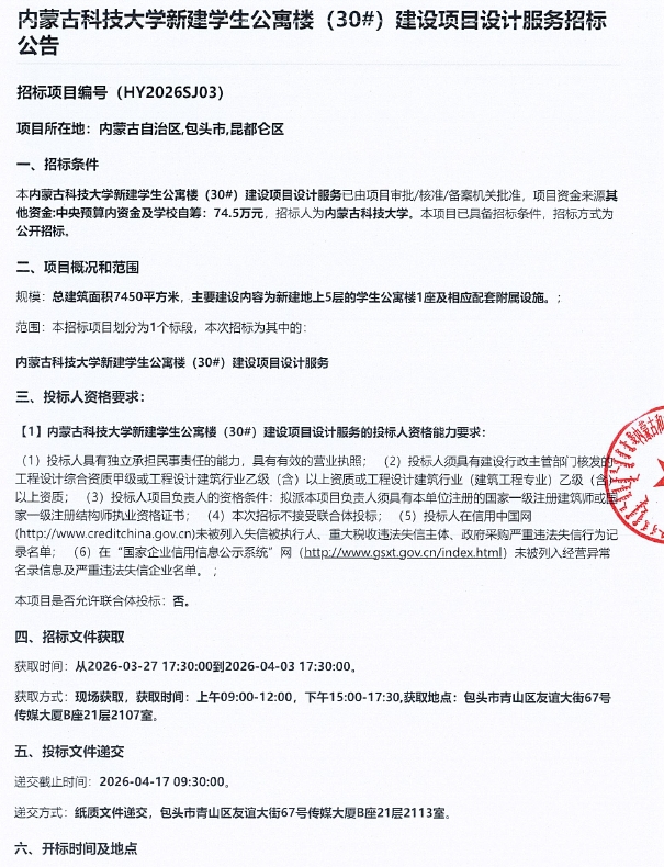 上一条:内蒙古科技大学10#、11#、12#公寓外墙保温修缮工程采购更正公告(第一次) 下一条:内蒙古科技大学云服务通算资源租用服务采购项目招标公告