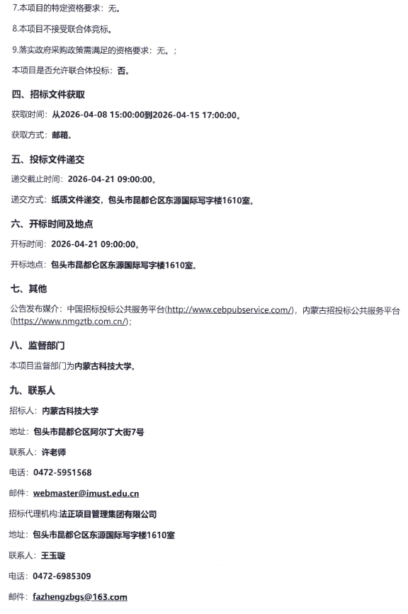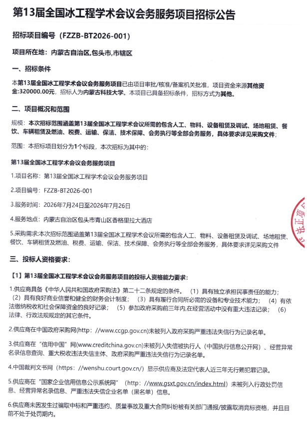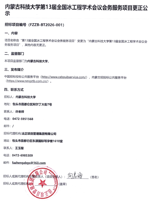 上一条:内蒙古科技大学校园部分区域绿化工程采购项目更正公示 下一条:内蒙古科技大学13#、14#公寓楼改造竞争性磋商公告