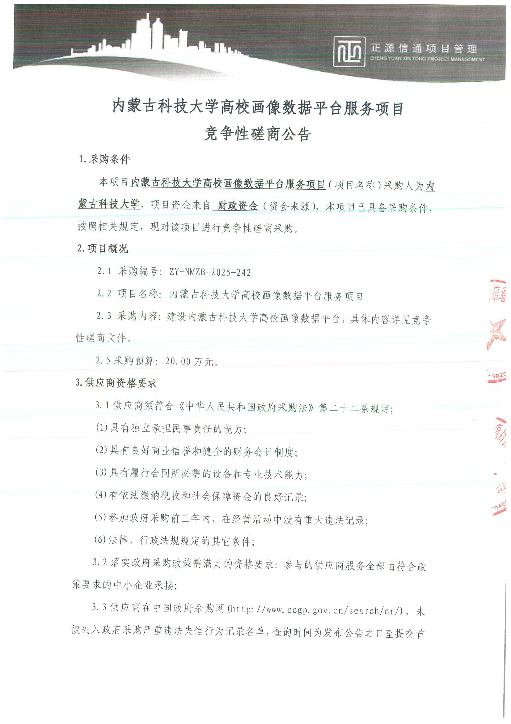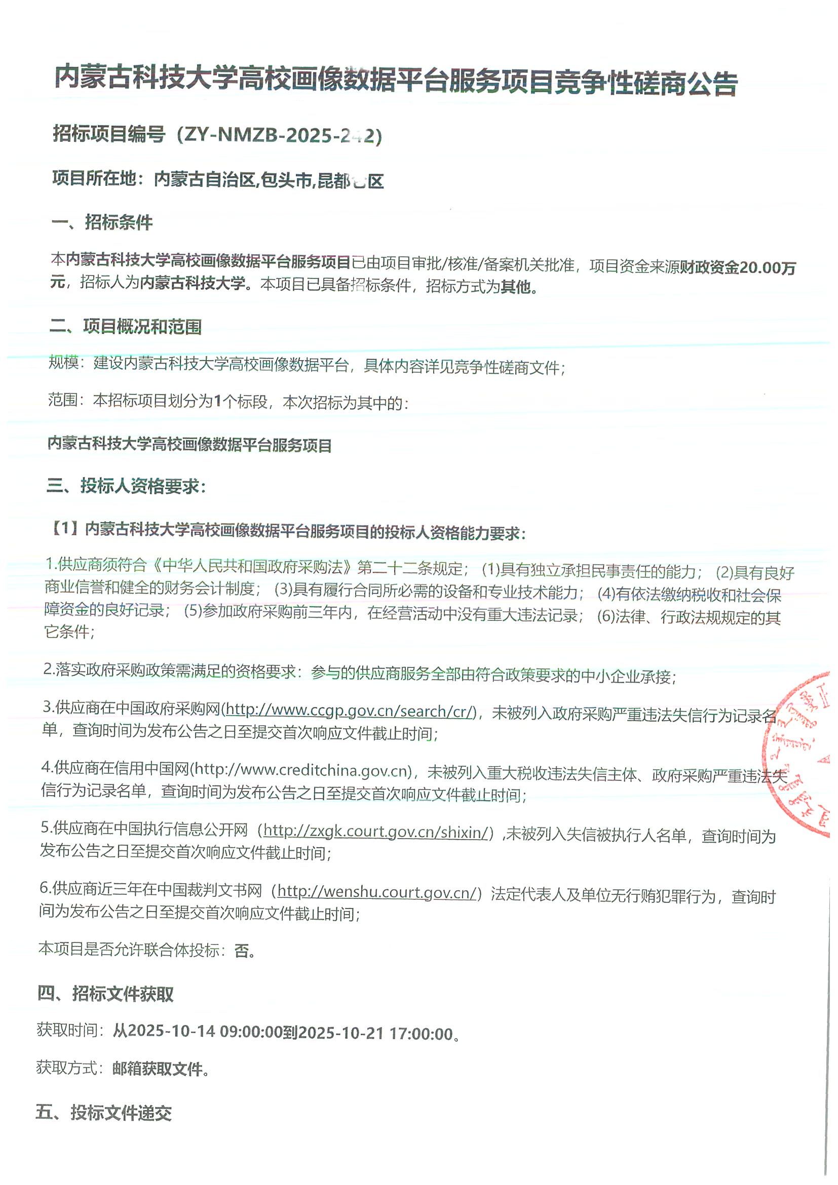 上一条:信息化建设与网络管理中心Web类应用防火墙维保服务采购项目(二次)竞争性磋商公告 下一条:内蒙古科技大学离退休教师节日慰问品采购项目询价采购公告