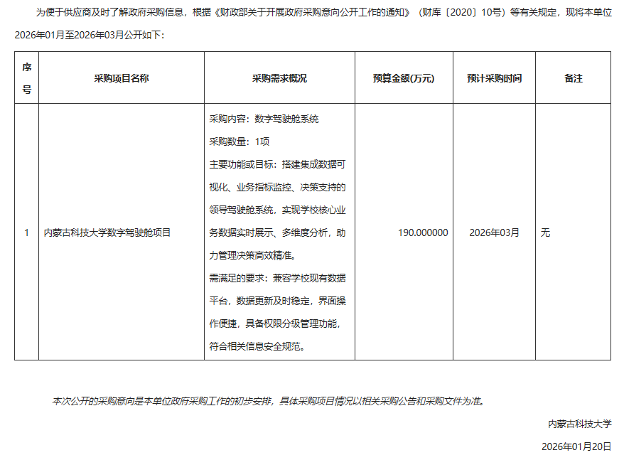 下一条:内蒙古科技大学2026年01月至2026年03月应用软件政府采购意向